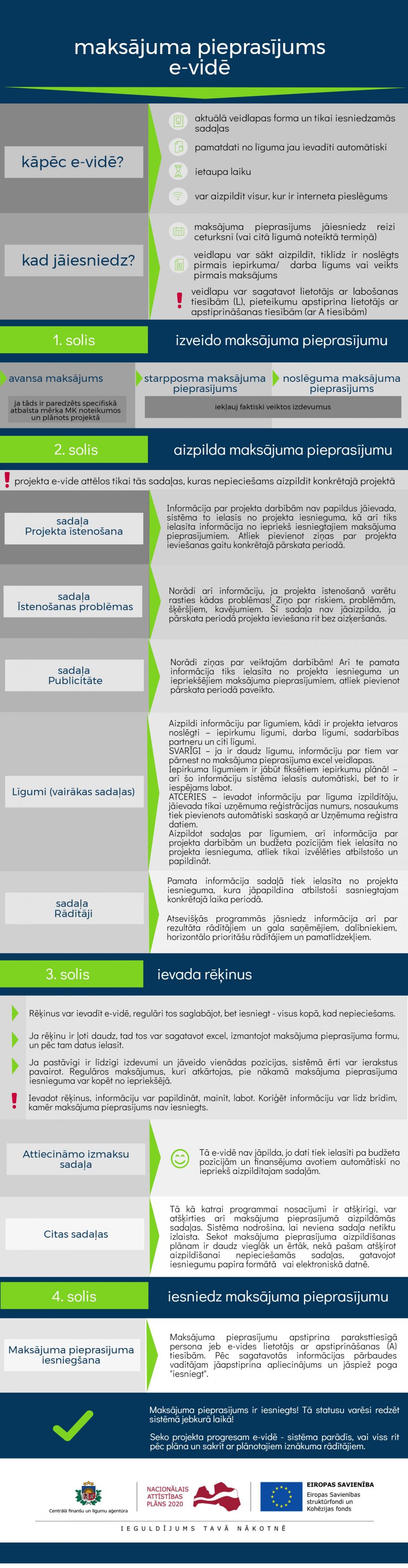 Maksājuma pieprasījumā tiek iekļauta informācija par faktiski veiktiem projekta izdevumiem un īstenošanas progresu, t.sk. par izsludinātiem iepirkumiem, noslēgtiem līgumiem, sasniegtiem rezultātiem, rādītājiem un cita informācija noteiktā laika posmā.